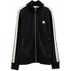 Elevate your wardrobe with the Moncler x Palm Angels collaborative masterpiece. This sweatshirt fuses high-fashion finesse with streetwear edge, showcased in its slick black hue accentuated by bold side stripes. Function meets design with a practical zipper closure, while the embossed logos celebrate the iconic partnership. The striking typography on the back adds an element of rebellious attitude. Crafted in RO, this piece is a testament to trendsetting craftsmanship.