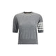 Thom Browne’s knit T-Shirt is a garment with a clean and distinctive style. With a ribbed crew neck and hems, it features the brand’s iconic bands on the left sleeve, a detail that underscores its unique identity. The ribbed hem with slight side slits adds a touch of modernity and comfort, making it perfect for a casual yet sophisticated look. A versatile must-have for any wardrobe.